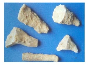 呈圆柱形或圆锥形,大小不一,长5~15厘米,直径2~7厘米。表面白色、灰白色或灰褐色,粗糙凹凸不平。质坚而重,断面较平整,洁白色或棕黄色,中央多可见一圆孔,圆孔周围呈多数圈层。气无,味微咸。滴加稀盐酸则产生大量气泡。